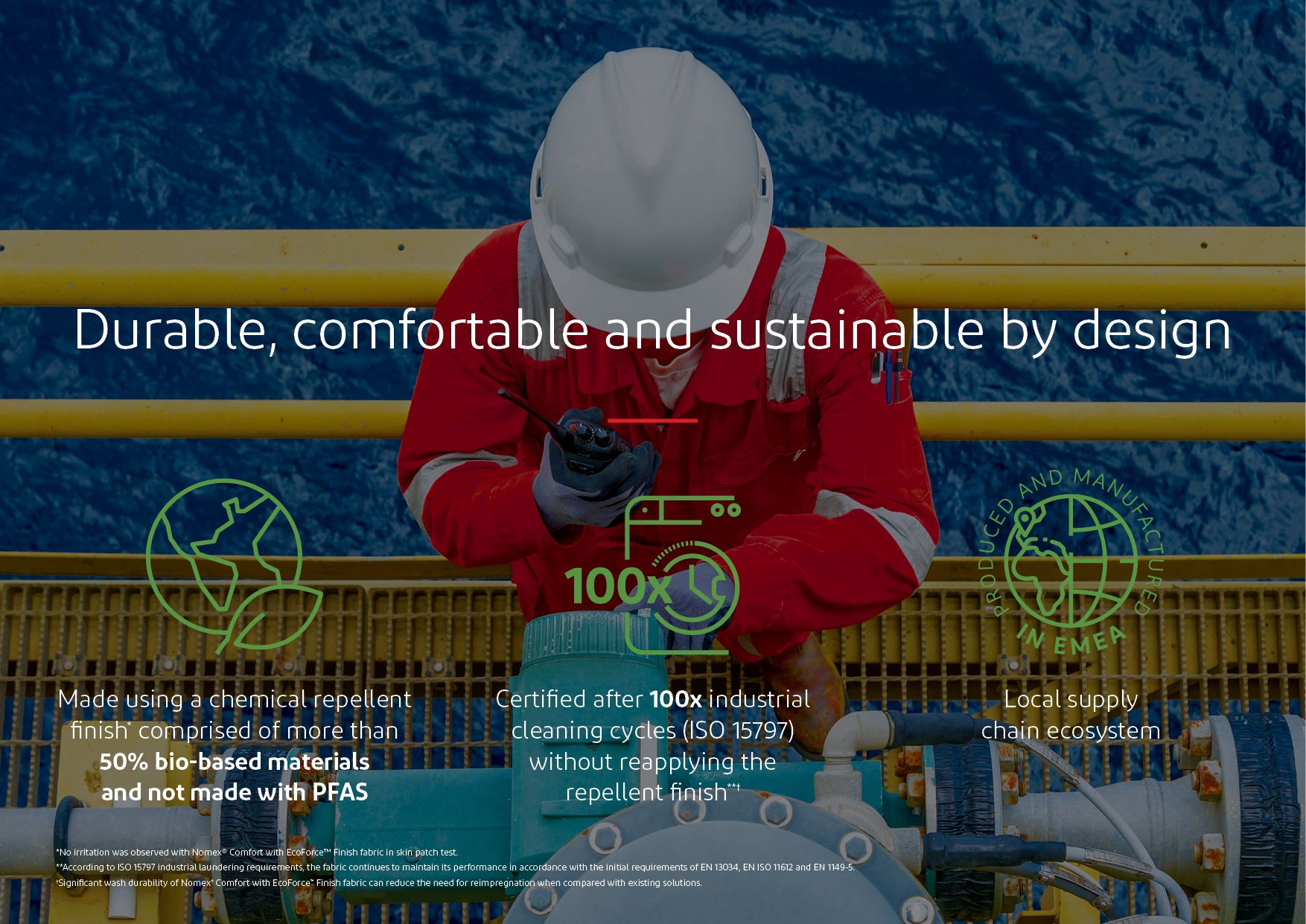 Made with a chemical repellent finish that’s made from over 50% bio-based materials and not based on fluorine chemistry, Nomex® Comfort with EcoForce™ Finish provides superior, sustainable performance that’s designed to last.