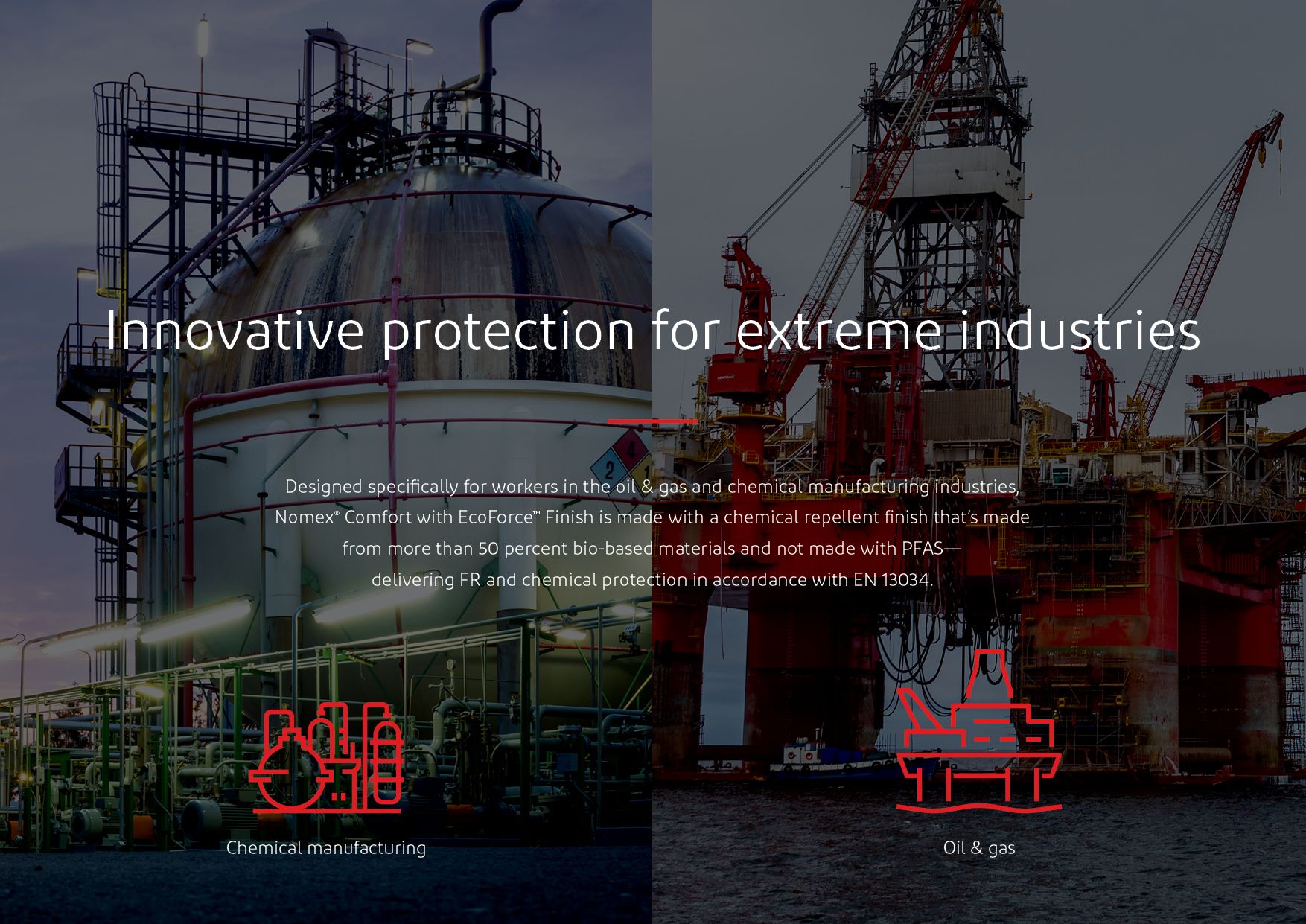 DuPont™ Nomex® Comfort with EcoForce™ Finish is designed specifically for workers in the oil & gas and chemical manufacturing industries—providing FR and chemical protection in accordance with EN 13034.